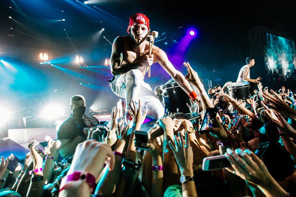 The next thing they do is something that may make your jaw drop. During "Ride", which peaked at number one on Billboard's Top 40, Josh actually plays drums on top of the pit, and it looks like a stationary crowd surf. They put a drum set onto a platform and he sits and plays just like he would sitting on a solid surface.