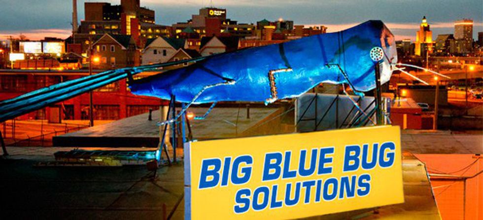 - A large blue bug permeates over Providence (the state’s capital and largest city). Visible from both sides of I-95 passing through Providence, this big blue bug is New England pest control’s mascot.