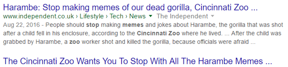 #Harambe. It is also good to note the change of the role of memes within society. Especially because this is a headline that actually exists in our universe on an actual political campaign website, and other headlines also exist very much in a non-comedic sense.