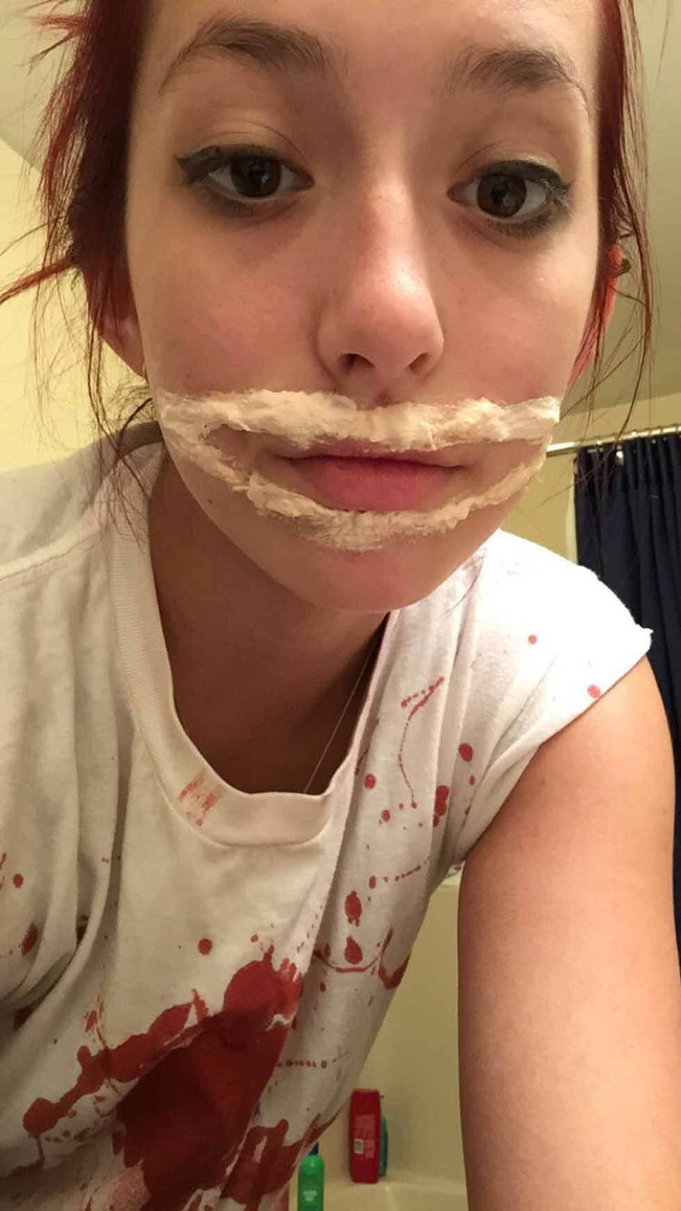 Create a cut open mouth by putting a layer of liquid latex around your house and layering cotton on top. See gash tutorial for more instructions on how to do this.