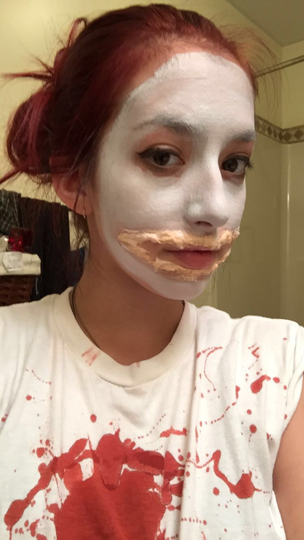 Materials: liquid latex, white, black, green and red face paint, blood, contacts (optional)