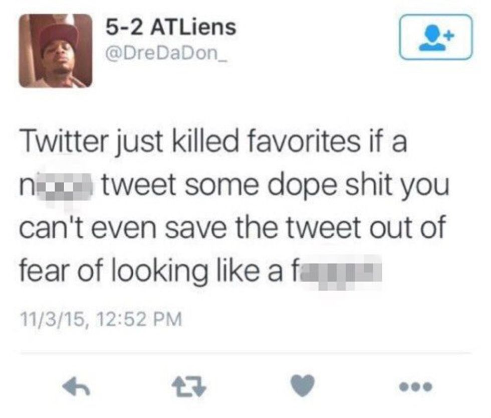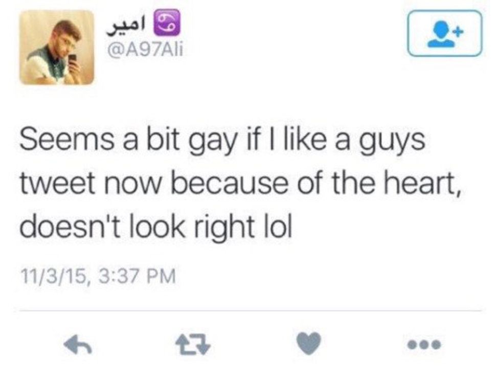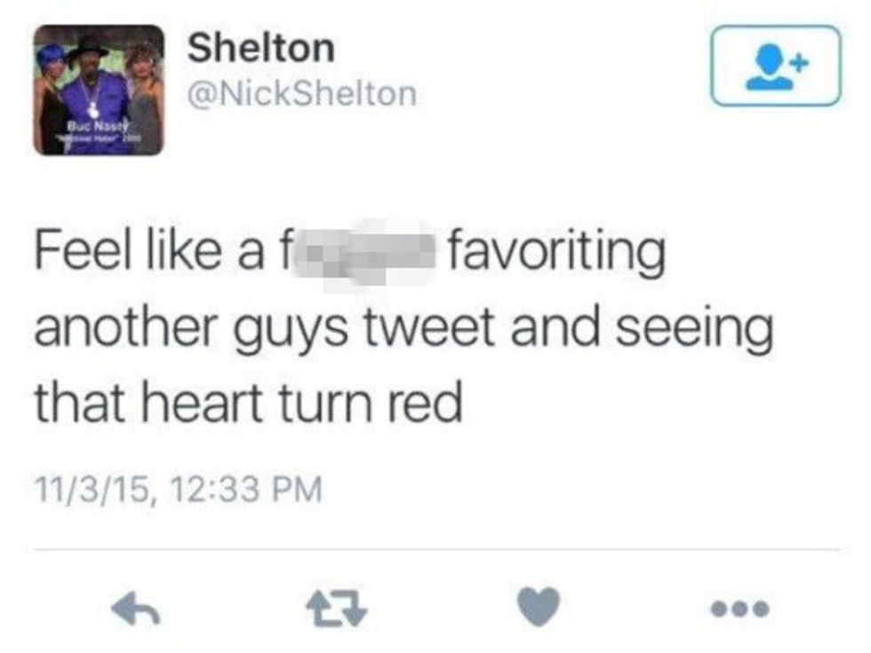 When Twitter first replaced its star button with a heart I thought absolutely nothing of it. I wonder what sort of research they conducted that brought them to believe the like instead of the favorite would be a worthwhile change to their website, but that was about it. It recently came to my attention that not all people took the new feature as minor change, more specifically some men felt this feature made them gay. As absurd as that might sound, it was brought to my attention by a tumblr post showcasing tweets by men. These tweets are saying that new heart feature makes men no longer able to like another guys tweets.