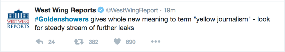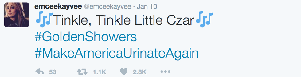 Of course, human nature took over on Twitter, which focused almost exclusively on the alleged sexual acts highlighted on the second page of the intelligence report rather than the threat to national security. The leak claimed that Trump had ordered Russian prostitutes to perform “golden showers” in a hotel’s presidential suite where he knew the Obamas had stayed. Soon after the report leak, the story was the second leading trend worldwide on Twitter, just after #ObamaFarewell. Regardless of the unconfirmed status of the report, Twitter users made sure Americans got the graphic details with hashtags such as #GoldenShowers, #PEEOTUS, and #MakeAmericaUrinateAgain.