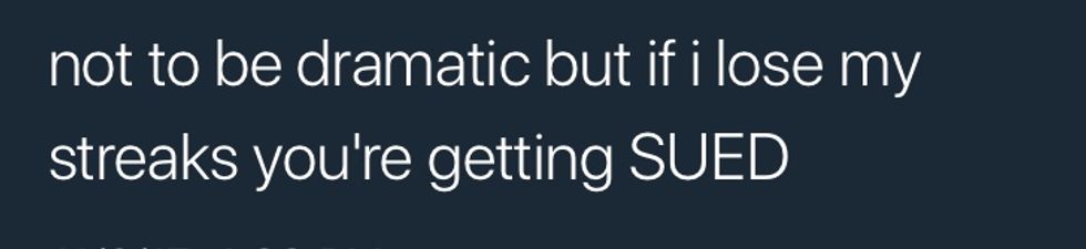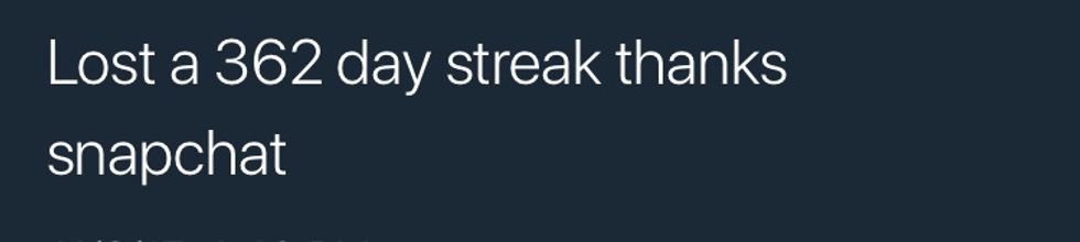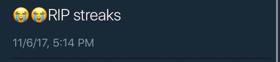 If you are a Snapchat user or keep up with today's teenage social media craze, you are well aware that Snapchat Streaks (sending Snapchats back and forth between you and another person for a consecutive number of days) have become a pretty serious thing, especially when it comes to them possibly being broken. My best friend and I had a 200 day streak going (*sings* "Started From the Bottom Now We Here") over the entire summer. One day, it unexpectedly snapped, and you know, I'm not going to lie - IT SUCKED.