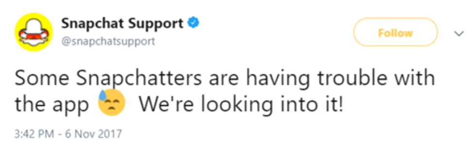 Around 3:45pm, Snapchat Support sent out infortmation regarding their awareness of the issue by tweeting this: