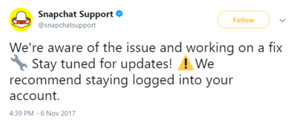 But, it was not until an hour later at 4:39pm, that Snapchat Support sent out another round of information on the crash warning users to not manually log out of their account by tweeting this: