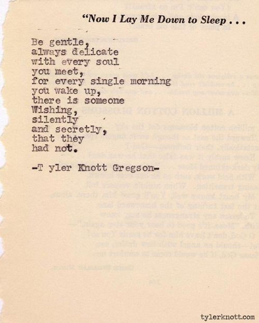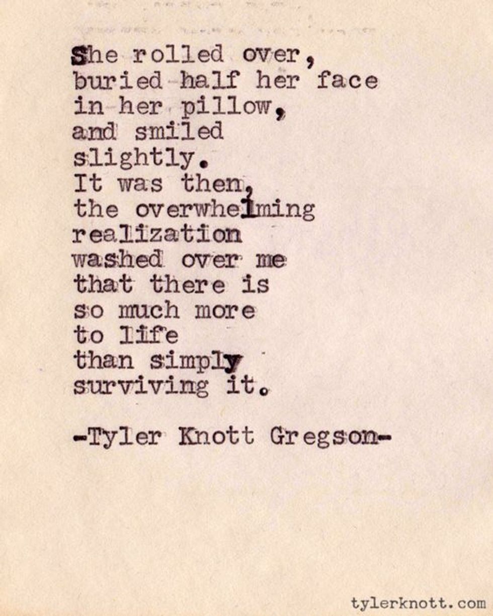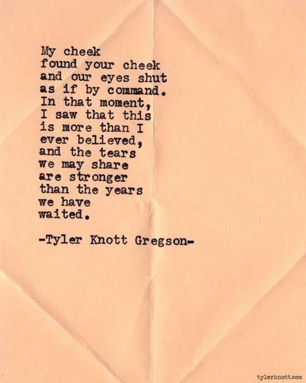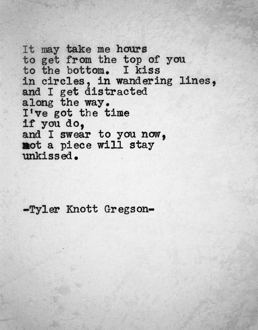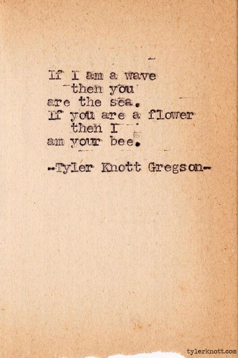 Tyler Knott Gregson is seldom talked about. In the phase of "Milk and Honey," Rupi Kaur is more commonly spoken of rather than this genius. Don't get me wrong, Rupi Kaur is just as beautifully spoken. To me, however, Tyler Knott Gregson speaks of love and life more deeply than many books and movies could ever ponder. His poems speak to the part of you that you're almost ashamed to have such an emotional connection with. His poetry has changed me and released so many of my little-known emotions toward love to my consciousness.