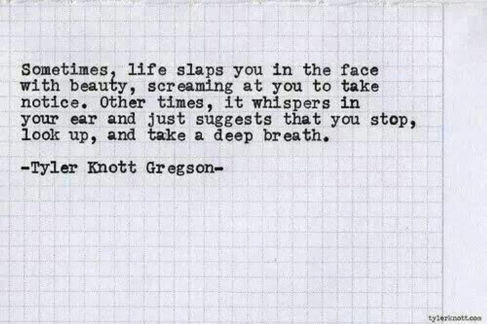 You don't need to climb mountains, parachute out of a plane, or hike miles to realize how beautiful life is. Sometimes just pausing, taking a breath, and evaluating your situation is enough to give you reassurance of how lovely this life is.