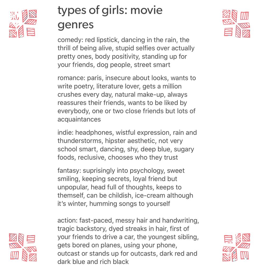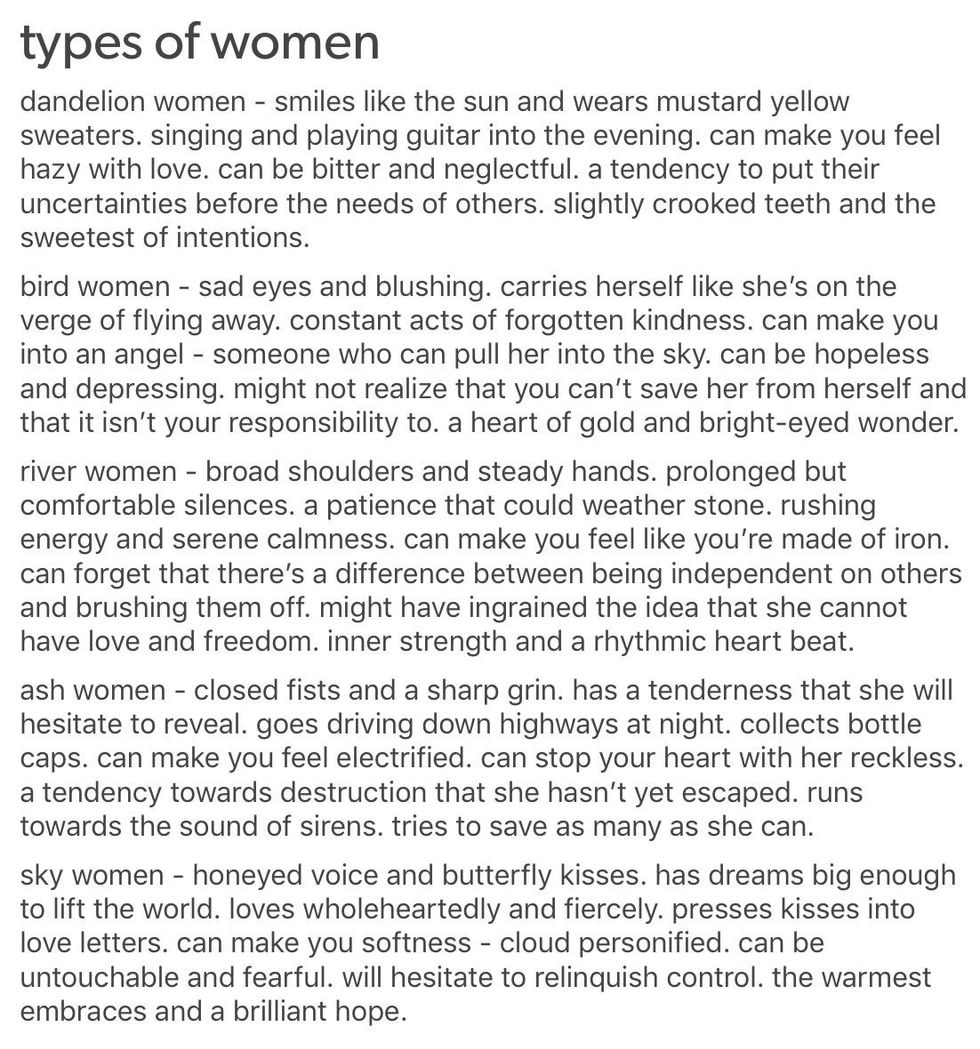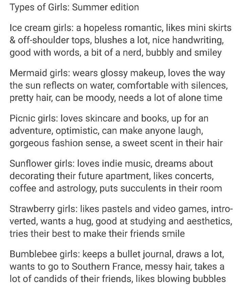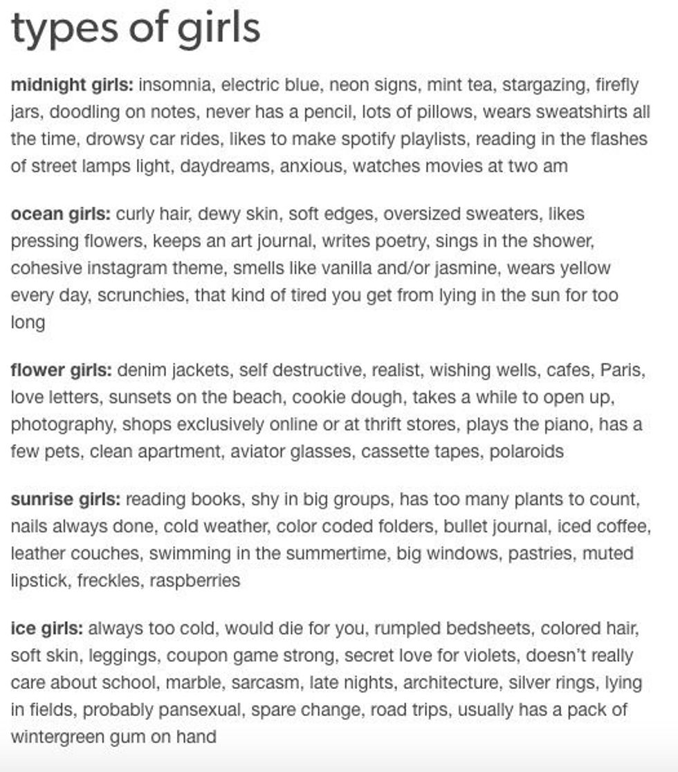 One of my new favorite trends happening on the internet at the moment is a collection of “types of girls”, descriptions of girls in various forms and genres. From stars, to movies, to cities, users are coming up with beautiful characteristics that describes us at any point in time. One day we might be a star girl, a night owl with glowing skin that loves rose gold and glittery makeup; and then the next day we’re sun girls, in love with adventures, and likes picnics and roses.