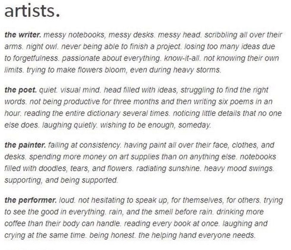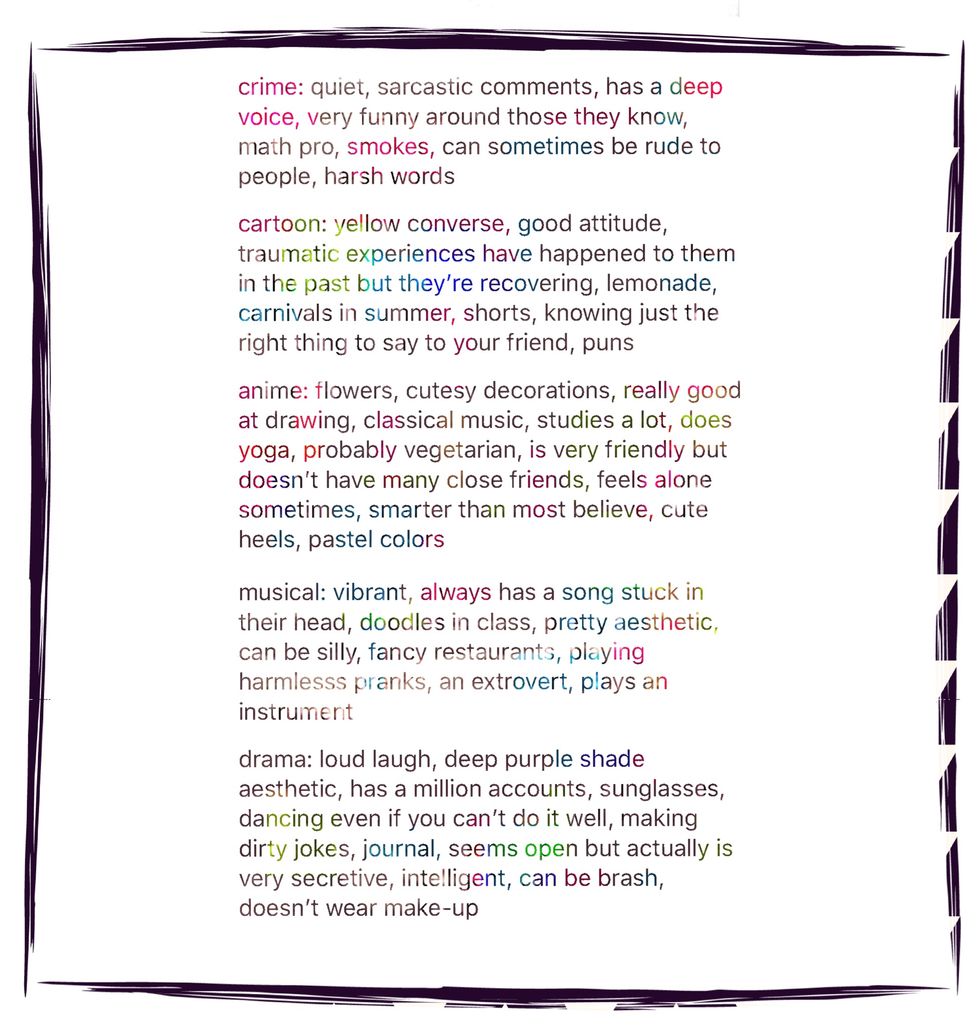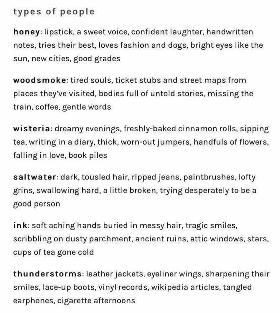 Rain Girls: likes diaries and making playlists, easily anxious, feels at peace among nature, sad resting face, very affectionate, has an eye for aesthetics