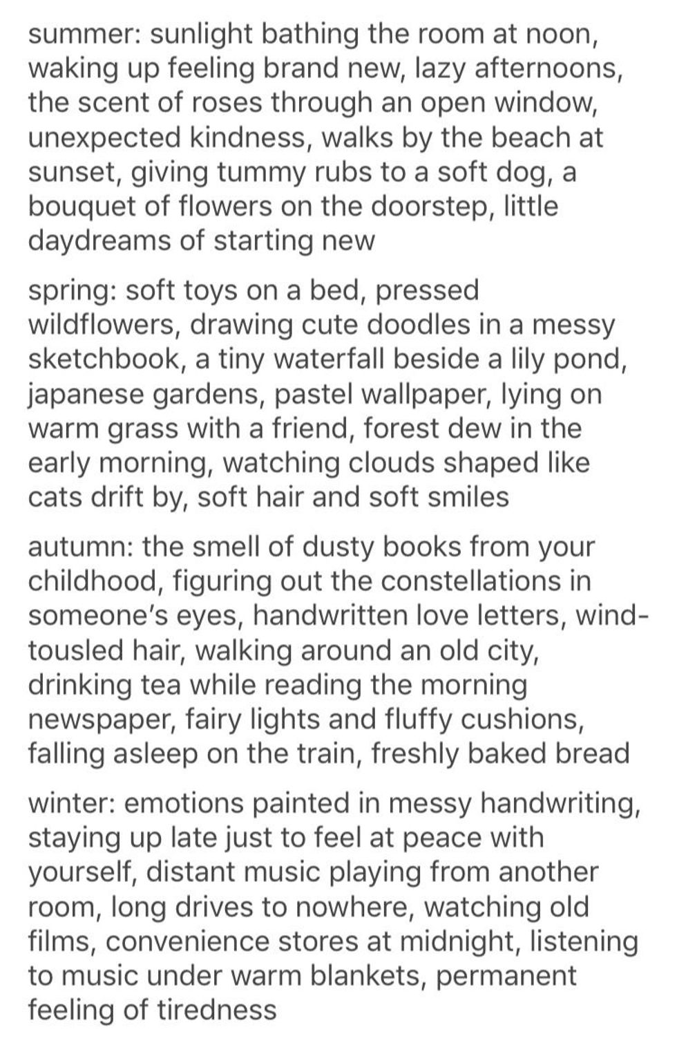 Warm: huge sweaters, dancing in the kitchen while waiting for something to cook, driving late at night, fields of flowers, smiles with scrunched up noses, fairy lights, song lyrics scribbled messily on the backs of hands, sliding around in socks