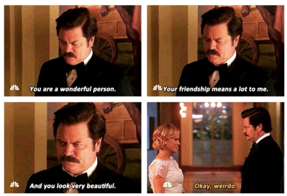 Listen, I can't talk about Jim and Pam for more than five minutes without feeling the need to ugly cry, so I'll make this quick. The person you marry is the person you will spend the rest of your life with, so doesn't it make sense for your partner to be your ultimate best friend? Pam and Jim have personally taught me this and much more. They also single handedly ruined any other TV couple for me by being the epitome of perfection, but you know, whatever.