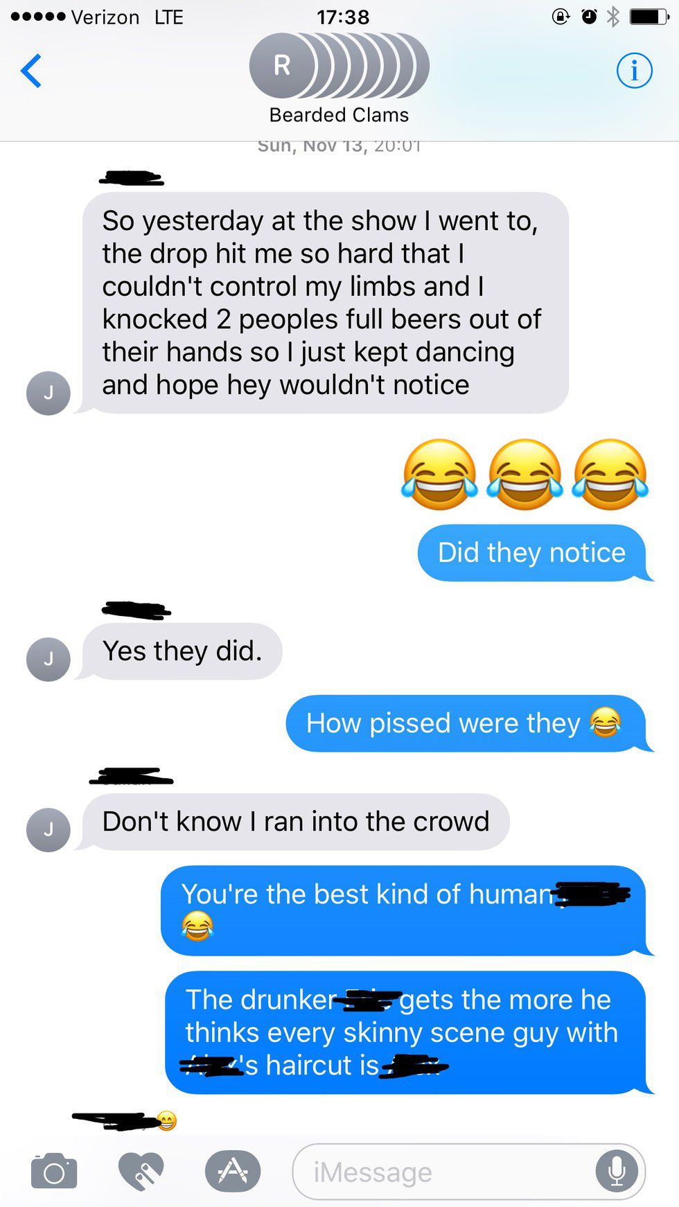 My group chat is comprised of twelve of my closest, most valued friends, and we represent every single one of these types (if not more than one simultaneously). We've been called the KY Jelly Club, Thotchester, Alien Orgy, Round Peg Square Holes, and we are currently the Bearded Clams. These are the people you send individual drunk videos to when you can't be together, engage in meme and gif wars, and talk about any and everything with. They lift you up when you're feeling down, collectively piece together drunken nights you don't remember, and share in your every success and epic failure.