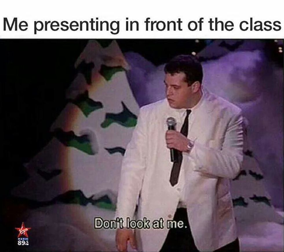 I hate getting up and speaking in front of the class, but that's just me. I would rather go home and snuggle up in my dorm by myself with a blanket and my laptop and work my butt off on a final paper than take an index card up to the front of the classroom and talk to my peers. I'll pass... (hopefully!)