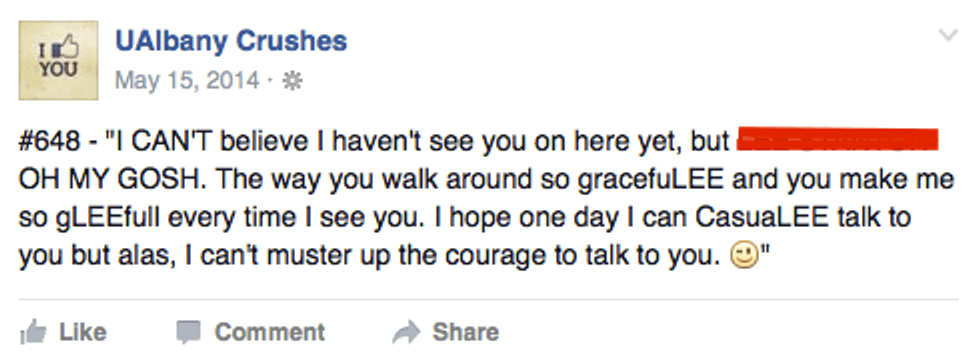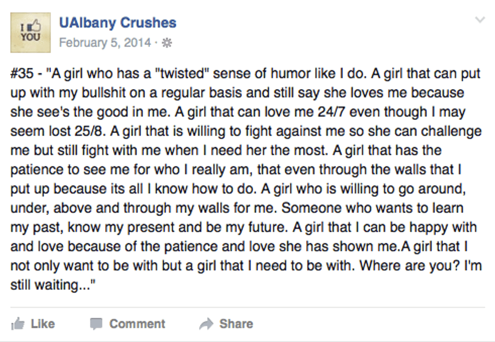 I don’t know what happened to the person who ran the page or even who they are. I’ve heard a few rumors some people said they’ve graduated, went abroad, or got broken up with so they gave love the middle finger. Regardless of the reasoning this is a plea to bring UAlbany Crushes back. I remember watching my friends get a tag on a UAlbany crush. It was so sweet seeing them smile from ear to ear learning they had an admirer somewhere. We need more opportunities to make people smile! I read whichever ones pop up on my Newsfeed and they are usually really sweet; some creepy ones definitely show up every now and then, but overall Albany crushes does more good then bad. So, let's keep it up.