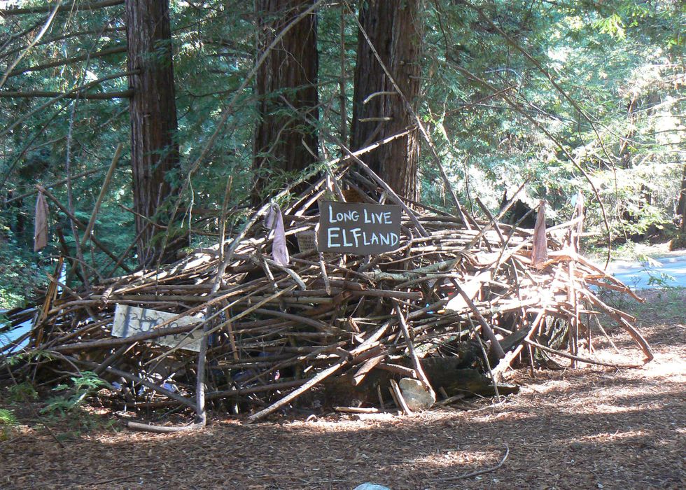 Elf Land consisted of a series of trails and “dens” that were started by a handful of self-identified Pagans who wanted to create a gateway into nature on campus. Along these trails were bridges, statues, and other additions of creativity to the already incredible landscape. The “dens” were social hubs scattered throughout the area, and were basically collections of sticks stacked into a tipi-like shape in the center of a “fairy ring” (a circle of trees that often results from redwood shoots growing after the mother plant has been logged). And, each den had its own theme. Among the many dens was a smokers den, where you could always get a smoke and chat. There were also dens with journals where people wrote poetry and notes about their experiences.