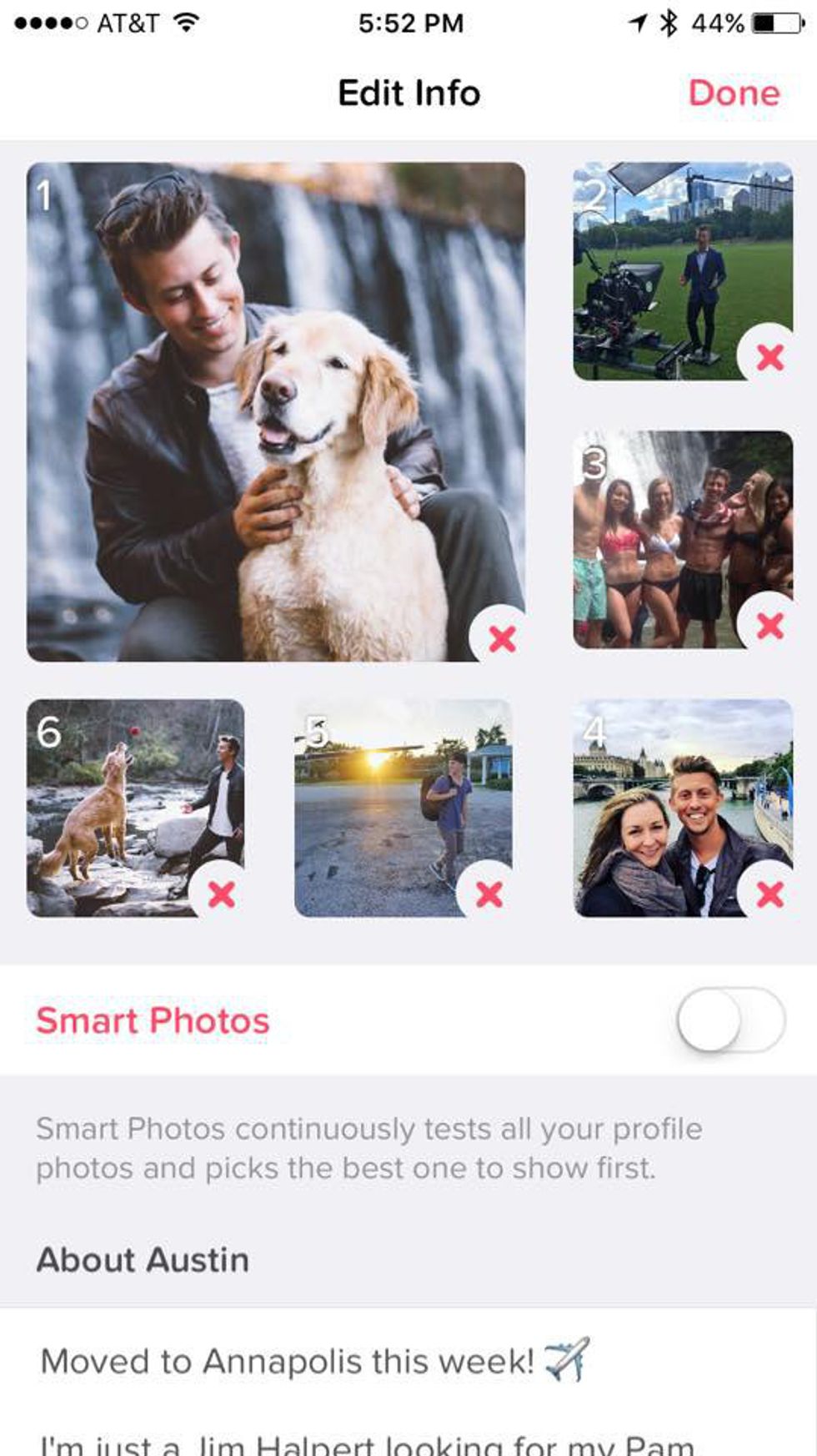 (1) "Out of your 5 photos, have one with yourdog, one that shows your adventurous side, a really clear face and body shot, a success photo, and a funny photo."