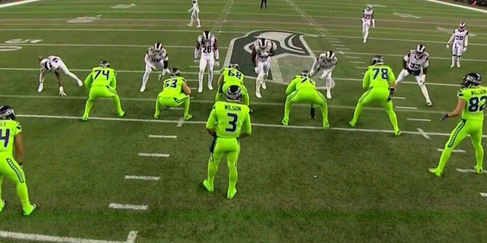 BLINDING... Props to anyone who managed to watch this entire game!!! They look like a neon green highlighter got mixed into the dye... or the jerseys were accidentally dropped into a bucket of the Nickelodeon slime... Poor Russell Wilson got to experience this for a second time now...