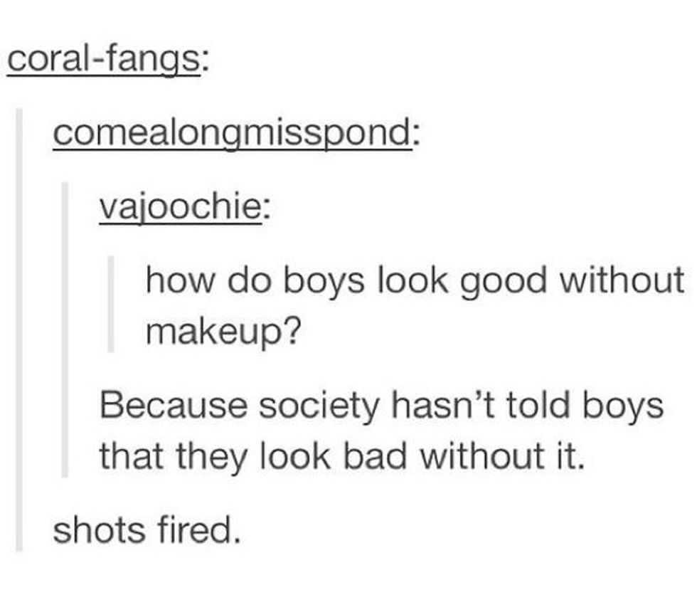 People often ask me "Why do you have so much makeup if you don't really wear it or need it" and I respond, "because it's fun," as it should be. If I want to have gloriously shaped eyebrows, then that's my choice. If I want my contour to be sharp enough to cut butter, then so be it. It should be your choice to wear makeup and don't let anyone, especially a dumb boy, tell you otherwise.