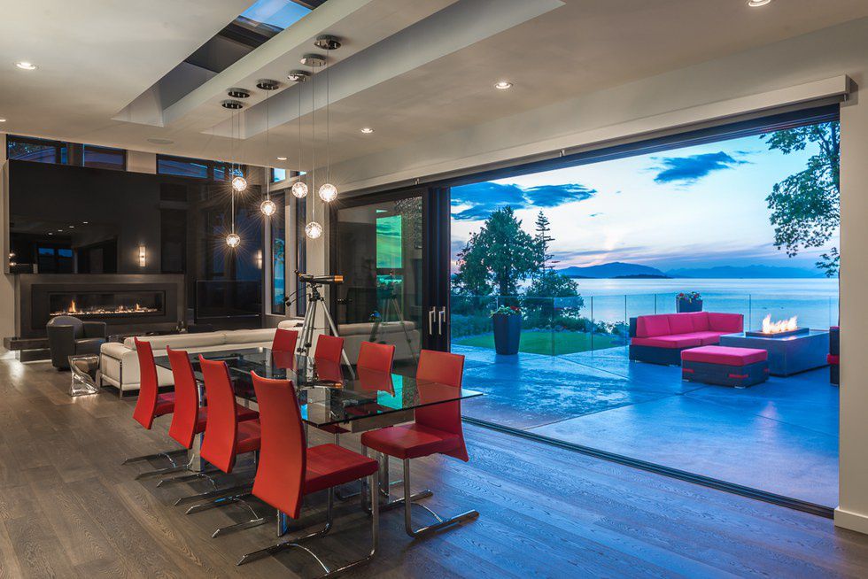 I want to have a modern living room. Modern furniture with a fireplace and an open ceiling make the room feel warm. It would be awesome to also have an ocean view like this one, especially if you love to watch sunsets over the water.