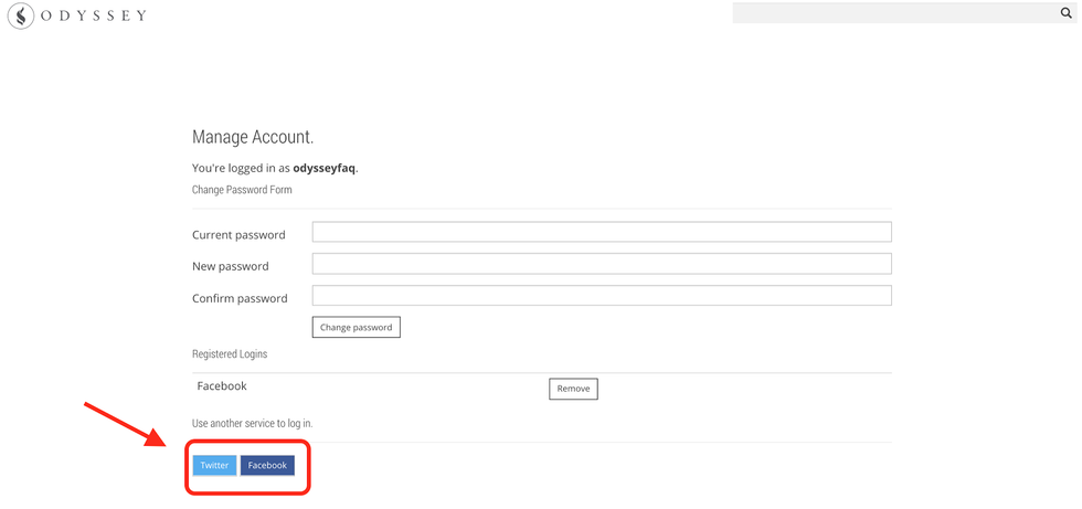 3. Once this page loads (Manage Account page), scroll to the bottom where it says “Use another service to log in,” with the Twitter and Facebook button below.