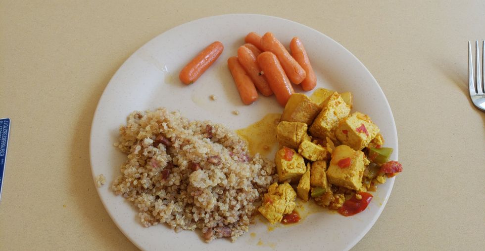 1. "Ham and cheese" quinoa, tofu scramble, and baby carrots at the Ike