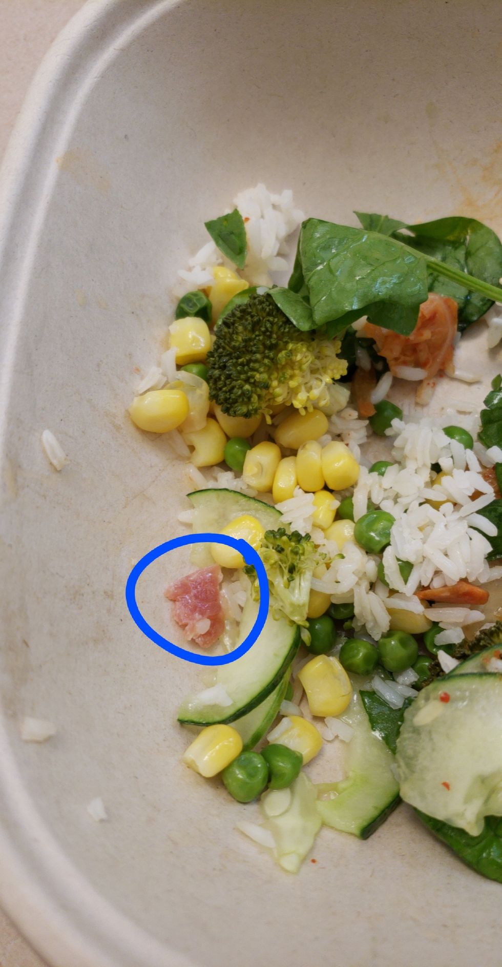 I found this piece of bacon that had fallen into my bowl, and after taking the photo I found a few more, which wasn't fun. Although it wasn't a huge deal that some food had fallen in by mistake, it just goes to show how easily cross-contamination can happen in the dining halls.