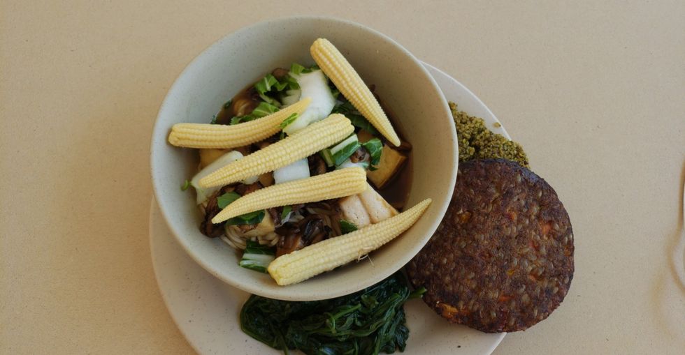 Noodles with tofu and baby corn, spinach, quinoa patty and veggie burger patty at the Ike
