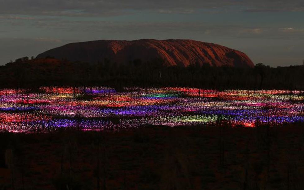 This desert landscape is transformed into a beautiful light display that includes over 50,000 solar powered lights scattered across Ayers Rock.