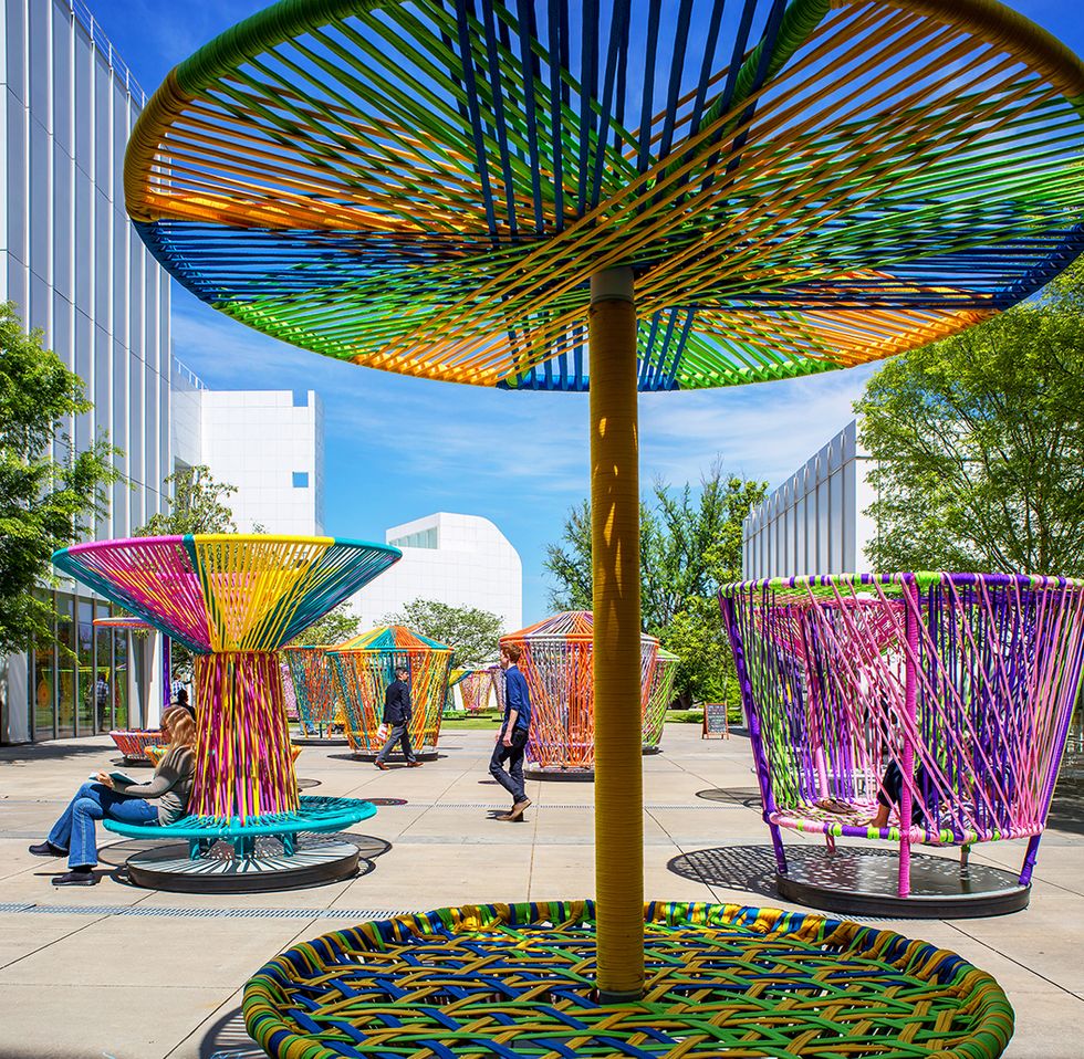 The oversized tops were created using traditional Mexican weaving techniques to bind together nylon ropes and pipes. The design allows students to either spin or just sit and lounge. A number of different designs are scattered throughout the University – from hourglasses to baskets.