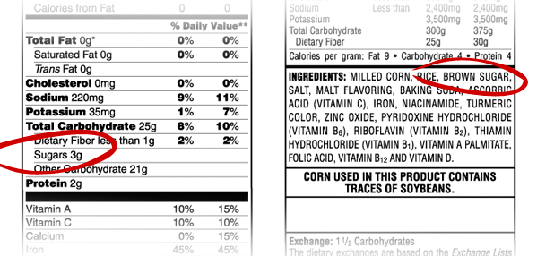 For example: by listing sucrose, dextrose, corn syrup or brown sugar companies make it so that sugar is not listed in top three ingredients.