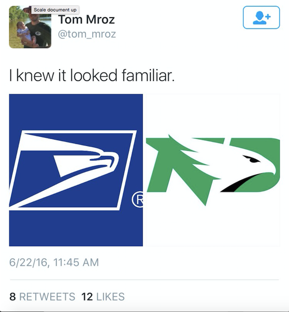 Earlier this year, there were several students who created possible logos for the new nickname and were rejected. Honestly, I can’t really think of a better way to show school pride than to have an actual UND student create the logo. Or maybe the University should have let Bennett Brien, the creator of the most recent Fighting Sioux logo, have a say in the logo process. Instead, UND officials chose to spend thousands of dollars to hire an out of state corporate design company in New York to create what we have here today, which is a sad attempt at what looks like a bad US Postal Service and Burlington Northern mashup.