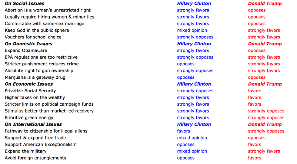 So, for all my fellow Americans who are still undecided about who to vote for in this presidential election, here is a list of completely unbiased, uninfluenced by the media facts about what each candidate supports, opposes, or is unsure of in this 2016 election.