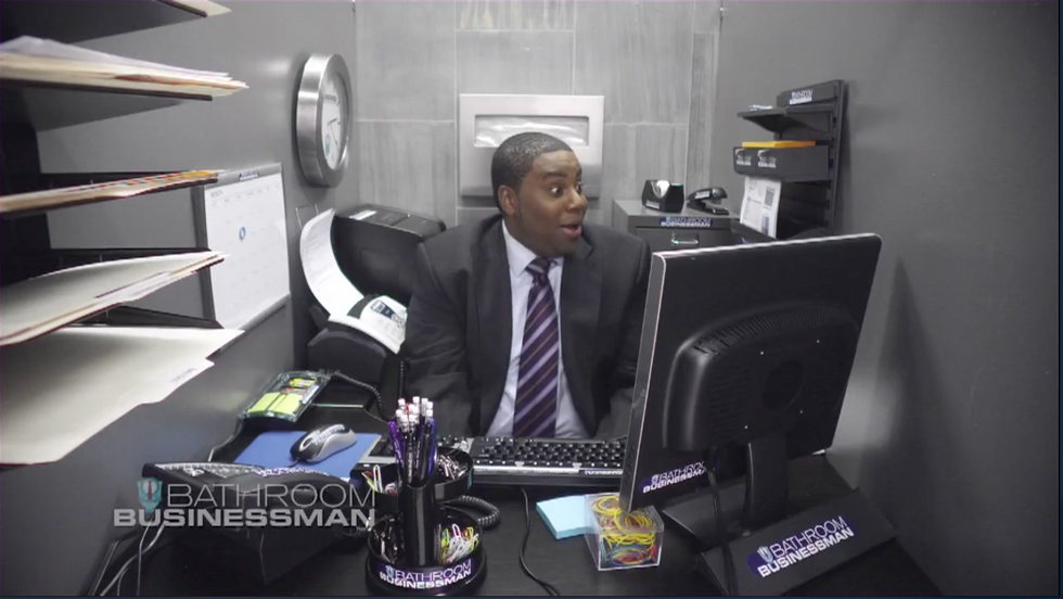 This sketch is a public service announcement for decency to tell people it is disgusting to work in the bathroom. In the skit, Kenan Thompson is a businessman with a portable office that he sets up in bathroom stalls. He increases his efficiency by working on the toilet, but ultimately faces a problem when he sets up his office space, but can not get to the toilet to sit down.