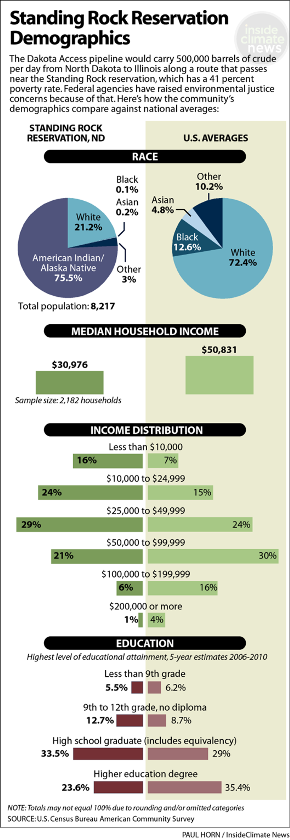 Martin Luther King once said, “Injustice anywhere is a threat to justice everywhere.” Through an environmental perspective, King’s words are just as true: failing now to halt corporations sets a dangerous precedent for future cases. Allowance of such liberties would only encourage government and corporation to do more in the future. If you’re having any qualms or doubts about the case for environmental justice, look at the graphic below, also from InsideClimate. Those demographics about race and class further highlight how communities that are non-white and economically troubled receive poor treatment from their government in terms of the environment. The issue is gross in complexity: culture, environmentalism, corporation, police, and government continue to clash in North Dakota. We can only hope that the entrenched demonstrators can keep the pipeline out.