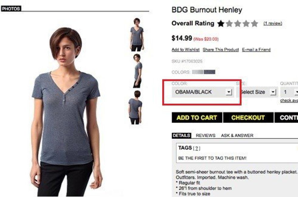 The “Obama/Black” t-shirt color option further demonstrates Urban’s incompetence. This shirt was presented in two color combinations: “White/Charcoal” and “Obama/Black.” Urban Outfitters quickly attempted to cover the mistake and of course apologized, explaining that they had initially developed a color that was “Obama Blue.”