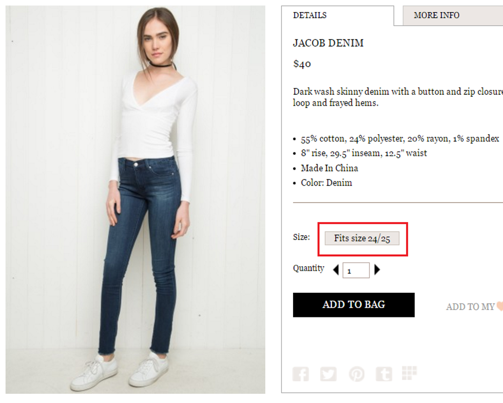 The brand endorses a “one-size-fits-most” policy and is not ashamed of it. Shopping at Brandy Melville is a surreal experience. As customers sort through the racks of clothing, labels read “Small” or “One Size,” which equates to a small or a small/medium. Even most of Brandy Melville’s jeans are “one size” and cater to a 24” or 25” waist.