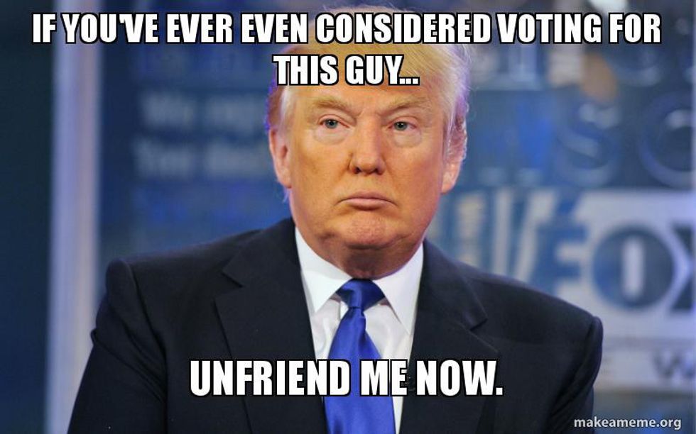 I get it, you don't like scrolling through your Facebook feed and seeing things that you politically cant stand, it just makes you angry. You begin to think differently about whomever posted the thing you disagree with. I have been seeing many Facebook statuses that angrily address all of their friends and family members, requesting that they just "unfriend" you if they are going to vote for X candidate (fill in the blank). There have also been memes of this same request floating around the internet. To all of those who think that they are justified in doing this, think again. I urge you to get over it. Get over being insulted by a difference in opinion and realize that disagreeing with people during election times is expected and it doesn't mean you have to lose friends over it.