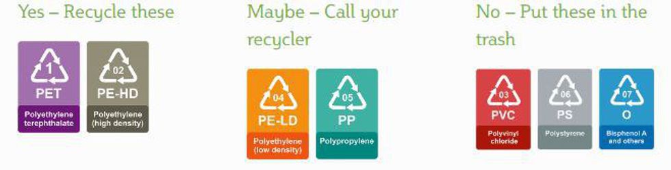 These symbols will always be on your plastics no matter what type. See the three to the right? Be wise when you buy and try to not purchase these plastics. For example, those plastic shopping bags most retail and grocery stores use are not recyclable! Next time you go shopping try to combine multiple items into one plastic bag, bring a reusable bag, or simply ask for a paper bag at the grocery store.