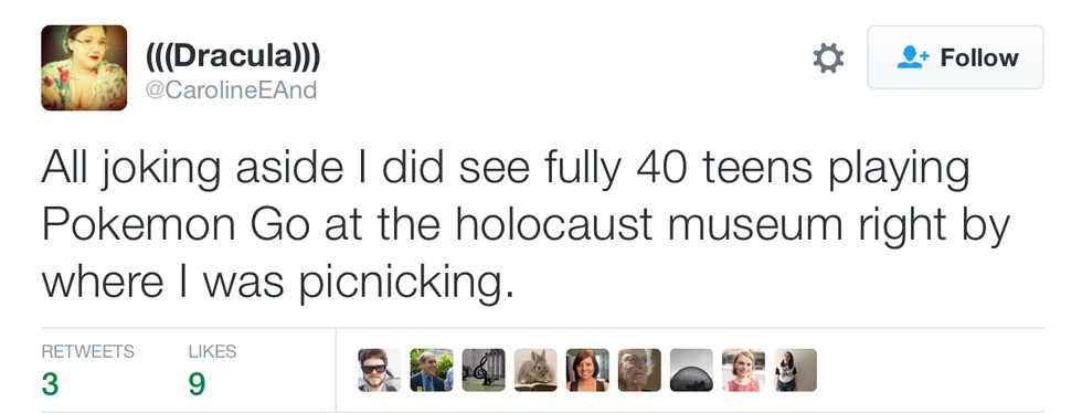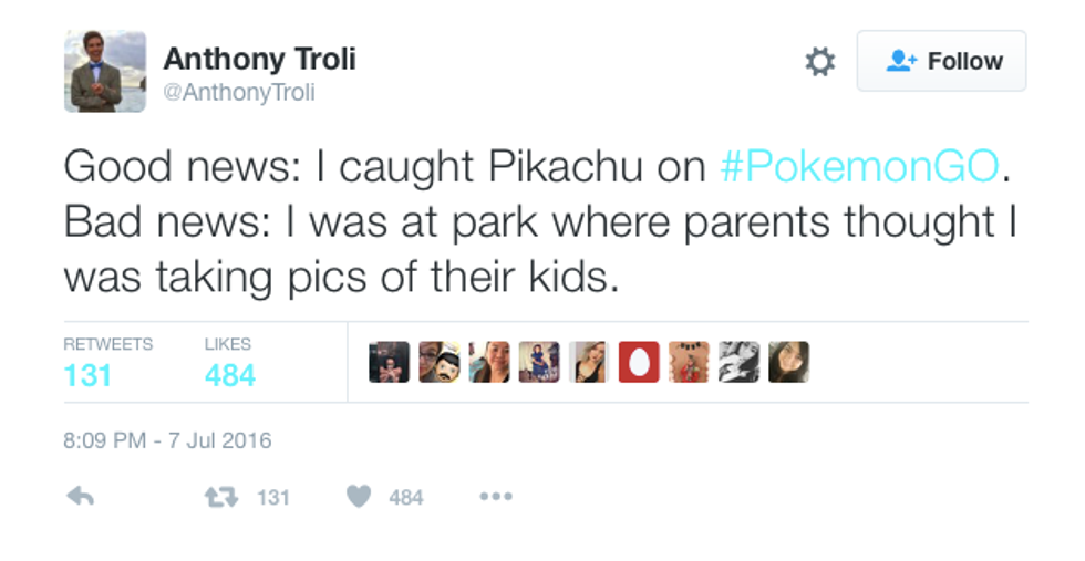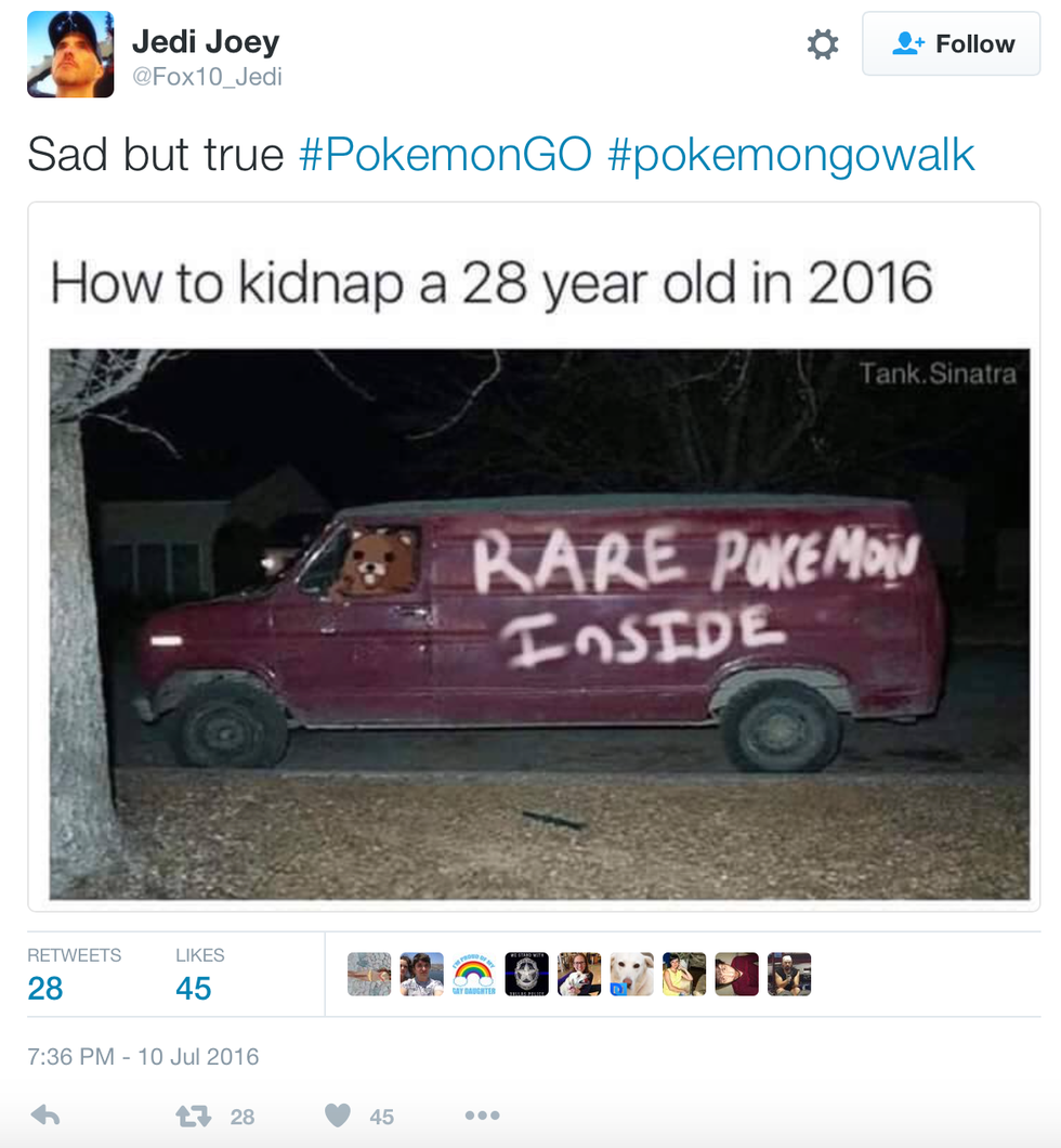If you're not at least vaguely familiar with the revolutionary concept, then congratulations, you live under a rock. But basically, the game uses augmented reality to make Pokémon appear live in your surroundings when you view the world through the app. So, naturally, with over 7.5 million downloads, the game has many users running about with their phones in front of their faces, creating not only some serious distracted walking, but also bringing the most dedicated players into interesting places and situations.