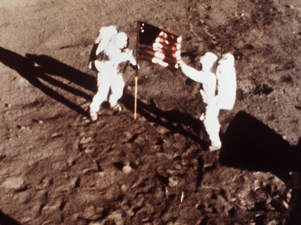 The United States lands on the moon and plants the flag on the surface on July 20, 1969. Neil Armstrong and Edwin E. "Buzz" Aldrin were the first two men to walk on the surface of the moon. This was part of the Apollo manned lunar landing program by NASA from 1963-1972.