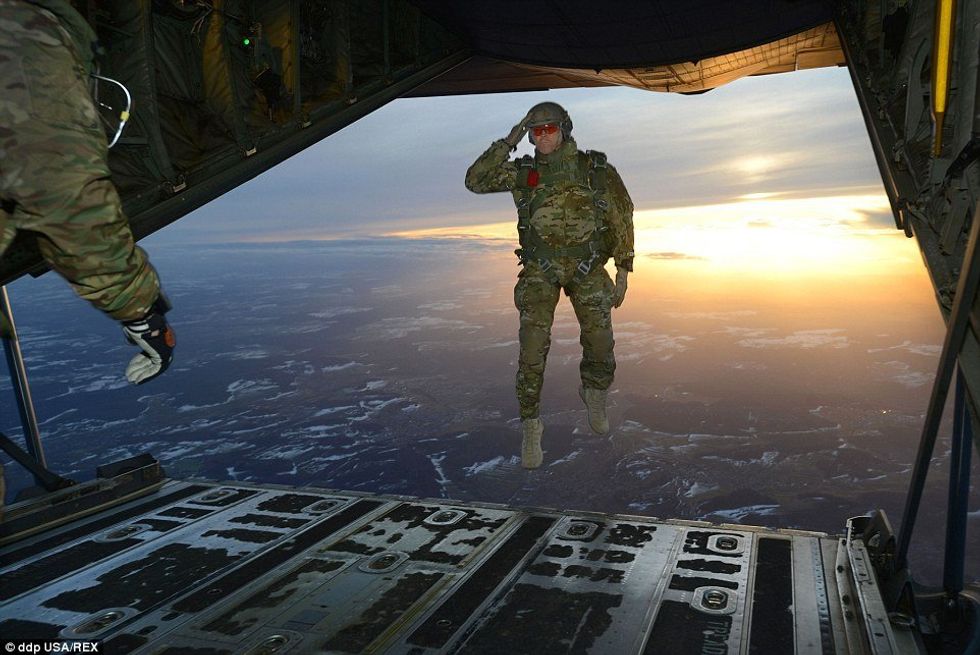 A US Special Forces Soldier from the 1st Battalion, 10th Special Forces Group salutes his brothers-in-arms as he jumps from his C-130 over Germany.