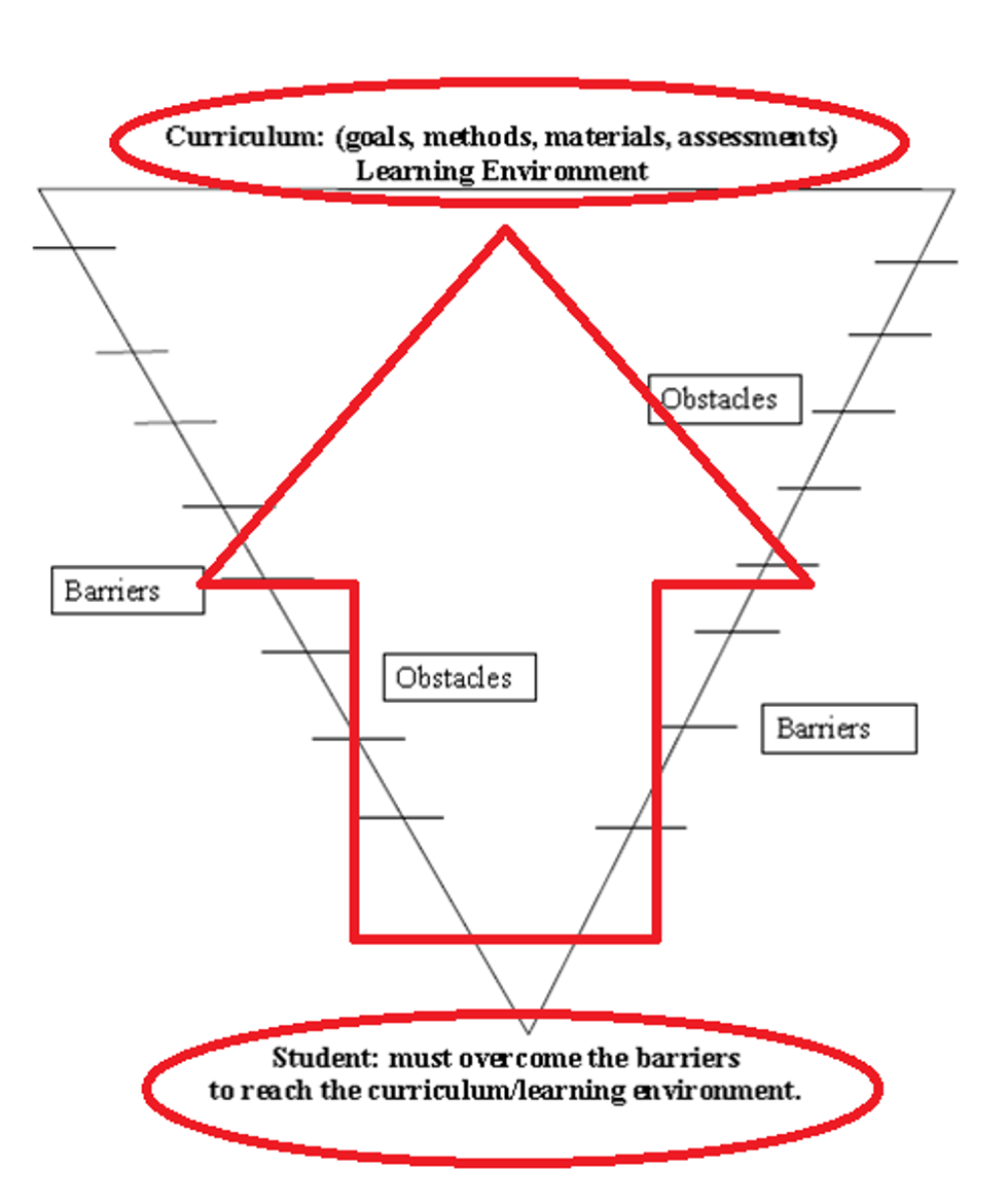 Traditionally, students enter the classroom (learning environment) as a highly variable learner and are expected to "fit" or "conform". In this environment, a student's strengths are relative to their ability to overcome the barriers and obstacles to learning. (see diagram below) The burden in placed on the student to do so.