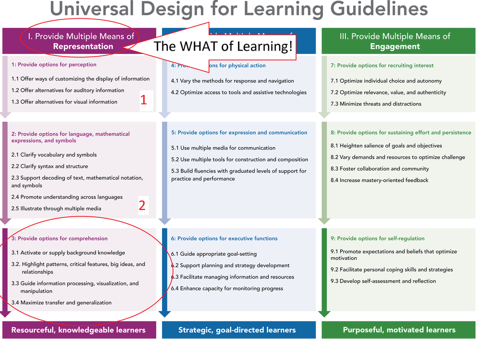 Options for comprehension more simply put are options to make sense and understand knowledge. This requires information processing. Again, this is not done in isolation of the strategic and affective networks of the brain (which we will begin to deconstruct next time). This information processing occurs as learners have options for perception (guideline 1), options for language, mathematical expressions, and symbols (guideline 2) while they selectively attend to the learning experience, integrate new information with prior knowledge, categorize strategically, and actively memorize (among other things). When designing instruction, we need to attend to “what” is getting in the way. Within the context of the learning environment, barriers can exist that prevent students from perceiving, decoding and comprehending. When a lesson or learning experience demands background knowledge, time for processing, prerequisite vocabulary, grammatical syntax/structure, mathematical notations (to name a few) they must be attended to, removed, or accompany the appropriate scaffolding, support, and resources so the student can gain access to the learning outcome.