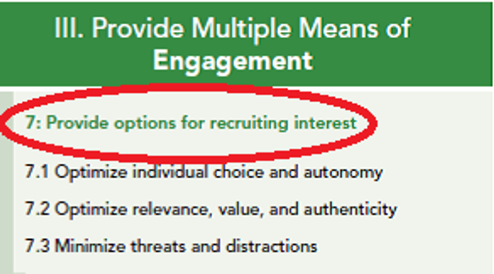 We are going to move to the principle of engagement, the affective network of the brain or the why of learning and build on that understanding as we move to a more acute understanding of guideline seven: provide options for recruiting interest.