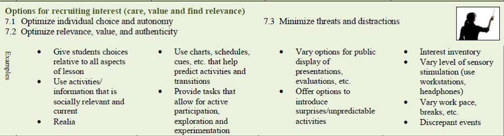 The affective networks “monitor the internal and external environment to set priorities, to motivate, and to engage learning and behavior” (Meyer, Rose, & Gordon p.54). Engagement is the doormat that welcomes or diverts the learner. The principle of engagement, as the preceding principles, is divided into three guidelines: options for recruiting interest, options for sustaining effort and persistence, and options for self-regulation.