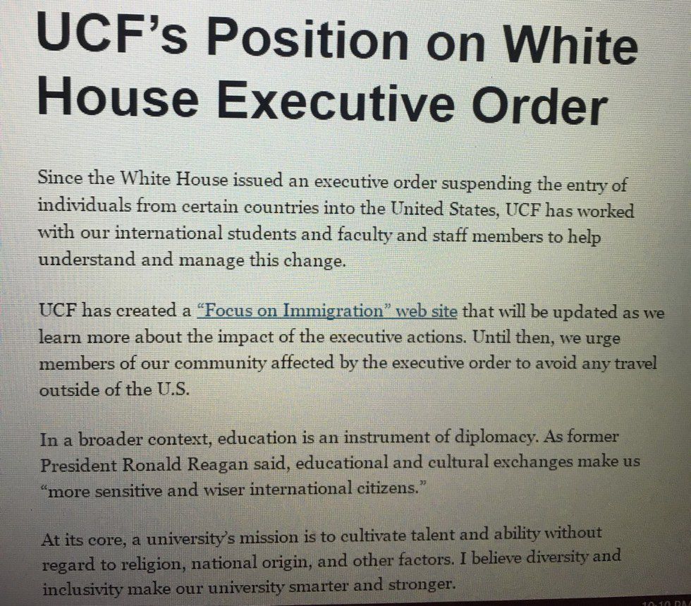Dozens of universities issued individual statements to students in response to the executive order, as well. President John Bravman of Bucknell University stated that, "the application of such limitations to members of our own community — and of communities across the country — is deeply distressing. We will stand united against acts that impede our commitment to inclusivity and, further, will push for decisions that reflect community and compassion.” President Christopher L. Eisgruber of Princeton University said that the school is working to help those affected by Trump’s order, including a small number of students who are currently traveling abroad and will be facing difficulties returning to the United States due to the new ban. He clarified his position on the ban when he stated that, "immigration has been a source of creativity and strength for this country throughout its history. Princeton will continue supporting students, faculty, and staff of all nationalities and faiths, and we will continue making the case for policies that simultaneously respect this nation’s legitimate security interests and allow for the free and vital movement of students and scholars across borders.”
