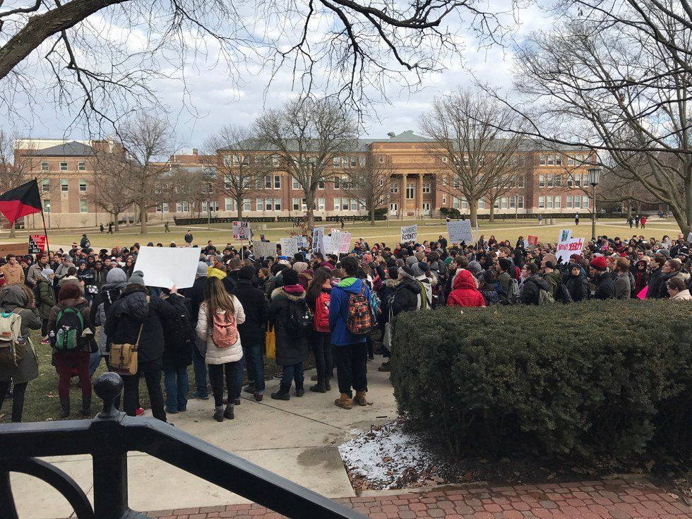 The protests here have only begun, though. I walked outside the English Building from my class this past Monday around 3:20 and there was a large group gathered in front of this building in the quad. It was full of students and teachers holding up signs and chanting "who's university?" "our university!". They formed a circle where a young Muslim girl spoke to the crowd. The more she announced into the megaphone, the more the crowd applauded and cheered for her in support. She told them she was not afraid and will not take away any part of her to make this country more "comfortable" for others. She explained immigrants are the backbone of America and that they are necessary for success in the United States. This protest walked the campus for the remainder of the day. I spotted a teacher who's sign read "I love my international students." There was love and determination through this unity I saw that day.