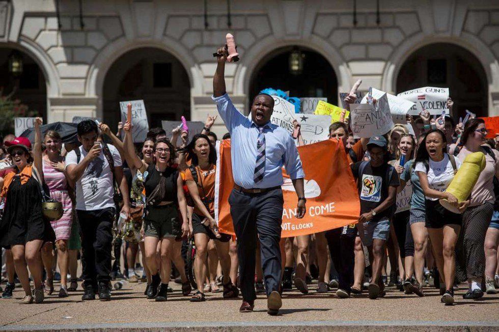 Hoping to draw attention to the absurdity of the situation, protestors are not only chanting around campus, but they are also carrying around sex toys. Bright and large dildos are being carried openly and proudly to class, in place of guns.
