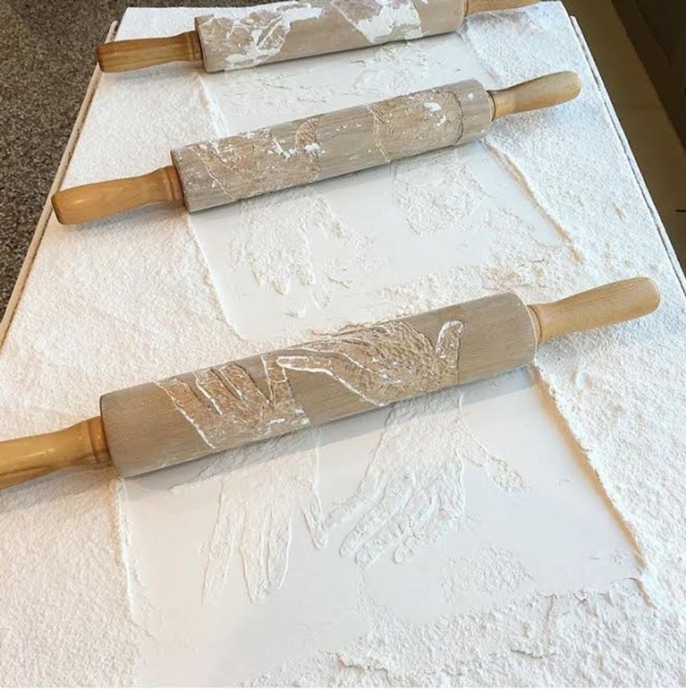 Rolling pins with artist's parents' hands, impressions left in flour on a table top.